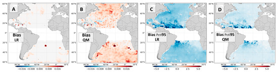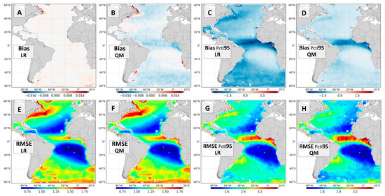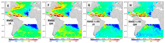 The absolute bias in the QM calibration is slightly higher than in the LR, since it does not minimize the overall error used to compute the bias in Equation (1). Therefore, by equally weighting the calibration throughout the percentiles, the bulk error metrics in the QM are not necessarily better than the LR because the importance was transferred to percentiles associated with fewer data. Nevertheless, the bias computed for values above the 95th percentile is much better in the QM calibration (Figure 7C,D)—with values below 1 m/s for the greater part of the Atlantic Ocean. The RMSE for data above the 95th percentile is also better in the QM, especially in extratropical latitudes. For latitudes between 5°S and 15°N the QM has not improved the LR results.