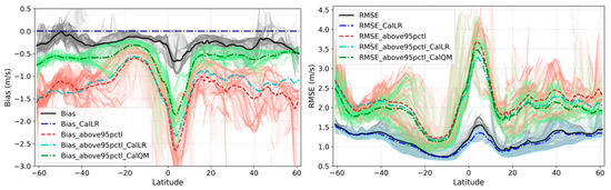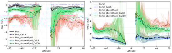 Reanalysis error (bias on the left and RMSE on the right) as a function of the latitudes, as a follow-up to Figure 5, where the thin light-color lines show the results of each longitude, and the thick lines are the average over the longitudes. The original errors of the ERA5 wind reanalysis are plotted in black (general conditions) and red (extreme conditions). The new lines in dark blue and green show the results after the calibration (suffix “Cal” in the legend), for general and extreme conditions, respectively.