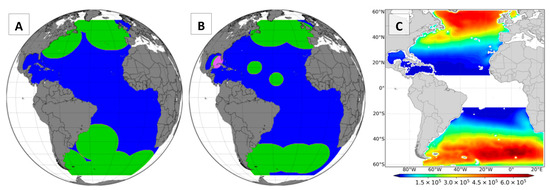 Considering the number of satellite missions and density of satellite data, as well as the accuracy of each satellite dataset [41,46] it was decided to restrict this study to a period starting in 2000. Thus, a total of 21 years, from 2000 to 2021, of ERA5 winds and AODN satellite data were selected. Figure 1C shows the total count of matchups satellite/reanalysis used throughout this study. Due to the polar orbit, the concentration is higher at polar latitudes. Smaller water bodies, such as lakes and seas, were excluded as well. Hence, only open water grid points in the Atlantic Ocean were selected.