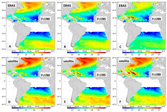 Comparison of surface winds (m/s) from ERA5 (A–C; top) and Satellite (D–F; bottom) under severe conditions: percentiles 90th (A,D; left); 95th (B,E; center); and 99th (C,F; right).