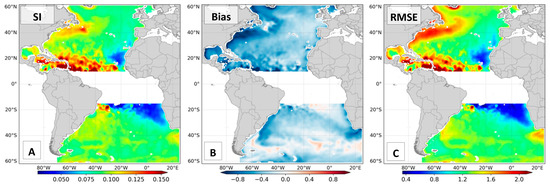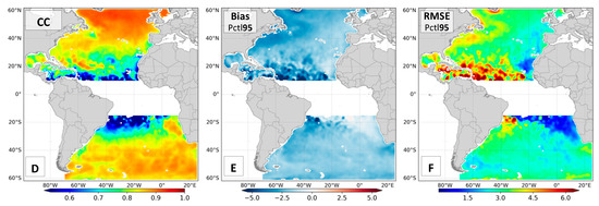The bias panel (Figure 12B) shows negative values in most parts of the North Atlantic, confirming the underestimation of ERA5 cyclonic winds, especially following the Gulf Stream and tropical latitudes. The systematic errors in the South Atlantic are lower, with bias closer to zero at mid-high latitudes—which proves the high quality of ERA5 under extratropical cyclones in the South Atlantic Ocean. A small underestimation was found at the Brazilian and Benguela Currents. The SI (Figure 12A), which is a normalized statistic, shows scatter errors of around 10% over a great part of the domain, and larger errors of 12% to 15% for tropical cyclones. The correlation coefficient at those locations is severely compromised, with values below 0.7. At this point, it is important to remember that critical errors presented in the SI and CC maps suggest that the complexity of such reanalysis limitation is much higher than a simple systematic bias that can be effectively reduced with linear regression calibrations.