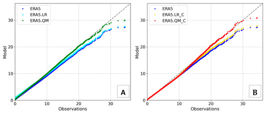 The Quantile Mapping Method (QM), also named the Distribution Mapping or Quantile–Quantile method, adjusts the cumulative distribution of the model (ERA5) to the cumulative distribution of the observations (satellite), being a very popular bias correction model. Since the quantile function is the inverse of the cumulative distribution function, the QM is a linear regression applied in the probabilistic domain that improves the representation of the calibrated distribution function, including its tail associated with upper percentiles. The QM theory was described by Sgouropoulos et al. [66], and applications in environmental sciences, including further theoretical explanation, can be found in [67,68,69,70,71]. Gonzalez-Arceo et al. [72] successfully applied the QM for wind speed calibration.