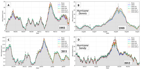 For calm-to-moderate wind intensities, the five curves (Figure 18) provide similar values, with better results of ERA5.LR and ERA5.QM due to the bias correction. Above 10 m/s the differences start to become more evident. The two winter storms, especially in Figure 18C, show the successful calibration of ERA5.QM and ERA5.QM_C that could follow the increase in extreme winds including the peak of the events—removing the underestimation of ERA5. Nevertheless, the hurricanes (Figure 18B,D) clearly show the failure of the five wind estimates, proving that none of the calibrations proposed are suitable for strong hurricane conditions. Therefore, the last Figure 18 exemplifies the benefits and limitations of the developed reanalysis winds and the bias-correction models.
