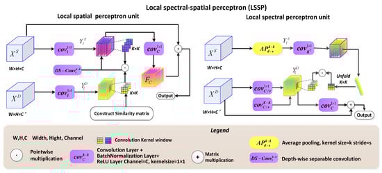 To effectively fuse multi-modal features, we established a local spectral–spatial perceptron (LSSP) in the encoders and dynamically integrated the dual-modal information into the convolutional operation. Figure 2 exhibits the details of the module structures. The LSSP can be flexibly embedded into residual network blocks with learning parameters. This module unit consists of two network structures with complementary functions: the local spatial perceptron and the local spectral perceptron.