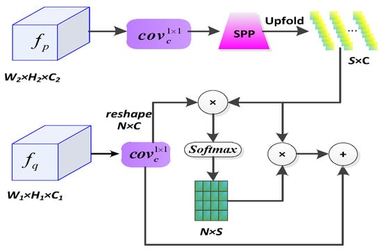 Additionally, since high-level feature maps have lower spatial resolution with a larger receptive field than shallow layers, pixel-wise interdependence is converted into pixel–regional correlations. To reduce the computational burden, a spatial pooling pyramid (SPP) [] is applied to resample feature maps using average pooling for f3~f5 and keeping the same spatial resolution. In the network, we adopted the average pooling operator using different pooling rates in SPP to aggregate multi-scale regional features. The above process can be modeled as Equation (12), where FqU is a new feature fusing global and local contexts.