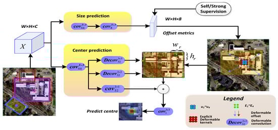 CenterNet [] provides a simple and efficient one-stage network framework based on an anchor-free strategy. This network represents the object as a point in the bounding box center by the CNN. Hence, the object center prediction determines the detection accuracy of the whole network. However, buildings exhibit multi-scale variation with different shapes and complex geometric structures. Convolution operation obeys the fixed grid computation structure with a limited receptive field, which causes contextual information loss for the center position regression. As illustrated in Figure 4, some buildings present irregular shapes, such as the “T” shape, “E” shape, ring shape, and narrow, long shape, where the building center does not exist in itself. As a result, the center point detector lacks corresponding context and semantic features, resulting in deviation of position regression. Moreover, the same building instance can be predicted with multiple center points due to its large size or spectral heterogeneity. To deal with this issue, we proposed an adaptive center point detector (ACPD) based on the CenterNet formulation, as shown in Figure 4.