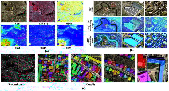 In the BISM datasets, noise points and outliers were removed for the 3D LiDAR point cloud data using the open-source software Cloud Compare []. LiDAR products were generated for different input strategies, such as normalized difference vegetation index (NDVI), digital elevation model (DEM), digital surface model (DSM), and normalized digital surface model (nDSM), as shown in Figure 5. The cloth simulation filter (CSF) [] algorithm was used to generate nDSM and DEM. Finally, the products derived from the LiDAR point cloud data were rasterized and resampled to a spatial resolution of 0.3 m.