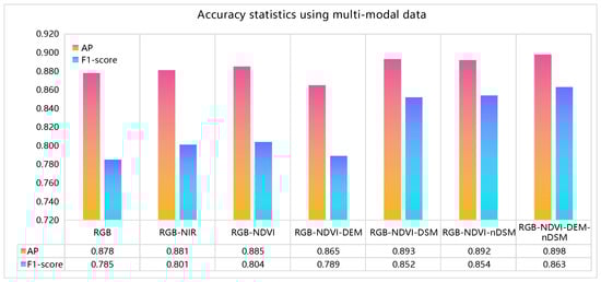 We first completed the comparative analysis in the experiment with RGB, RGB–NDVI, and RGB–NIR. Compared with inputs only using RGB, it can be observed in Figure 6 that the accuracy was improved by 0.3% AP and 1.6% F1-score when using RGB-NIR. Similarly, RGB-NDVI as input achieved a slight increase compared to RGB-NIR. However, when DEM was introduced into the model, the prediction accuracy decreased by 2% AP and 1.5% F1-score. Probably, the DEM could not represent the height variation of the buildings, and noise was introduced into model training. In contrast, when RGB-NDVI-DSM was fed into the network, the prediction accuracy was significantly increased by 1.5% AP and 6.7% F1-score compared to RGB, which indicates that LiDAR features can increase the accuracy of segmentation. The accuracy did not obviously change using RGB-NDVI-nDSM. However, the last group with DEM and nDSM achieved better results than the other groups, with 89.8% AP and 86.3% F1-score. Therefore, we used RGB-NDVI-nDSM-DEM as multi-modal data in subsequent experiments.