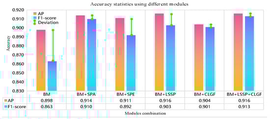 Figure 7 shows the impact of the ablation studies on different modules with the accuracy of the results. Although AP presented a slight increase of 1.3%~1.6% when using BM + SPA or BM + SPE compared to BM, segmentation results significantly increased with an F1-score about 5% higher than BM. In general, the LSSP module improved prediction accuracy from 89.8% AP to 91.6% AP and 86.3% F1-score to 90.3% F1-score. Compared with BM, detection accuracy using CLGF slightly increased by 0.4% AP, but segmentation accuracy improved by 3.8% F1-score. In addition, detection and segmentation tasks had a large accuracy deviation between AP and F1-score when using BM or BM + SPE, while other combinations had relatively small variations. This indicates that the SPA made more contributions to the segmentation task than the SPE. In general, the detection accuracy was higher than the segmentation accuracy since the ROI region had an impact and limitation on the segmentation results. As a result, the above analysis demonstrates that the proposed modules can improve the prediction accuracy, and their combination gains more.