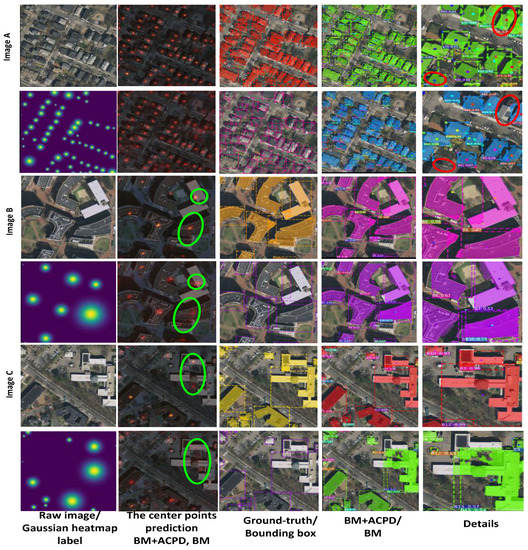 The prediction results from three images were visualized, as displayed in Figure 10, to visualize the result performance. Dense and small-scale buildings exist in test image A with shadows and cement surfaces. BM + ACPD achieved better building segmentation results. However, some buildings were not detected using BM, as shown by the green ellipse.