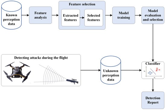 The framework of our PerDet approach is presented in Figure 5. Firstly, we collect perception data through real flight experiments. These data are classified into two classifications: the normal and the attacked. Secondly, the feature analysis is performed on various sensor data based on the principle of the attitude estimation and position estimation, so that we can select relevant sensor data types as features. Thirdly, we further carry out the feature selection to extract significant features and discard the irrelevant or lower correlated features, so that we can make sure the selected features are the most representative features and can decrease the training time. After that, multiple machine learning algorithms run on our dataset with selected features for model training. Then, we evaluate these trained model and choose an appropriate classifier as our PerDet detector. PerDet reads the unknown flight data, and then determines whether the UAV has been attacked and produces a detection report to record the detection process and results.