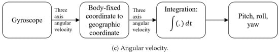 For the attitude analysis, the data provided by the accelerometer, magnetometer and gyroscope are discussed, as shown in Figure 8. The XY-axis acceleration can be used to calculate the pitch angle and roll angle, as shown in Figure 8a. The three-axis magnetic force (i.e., , and ) is first transformed from the body-fixed coordinate to the geographic coordinate (i.e., , and ), and then the magnetic force is mapped to the horizontal plane for the calculation of the yaw angle, as shown in Figure 8b. The three-axis angular velocity is also first transformed from the body-fixed coordinate to the geographic coordinate, and then the angular velocity can be integrated to the pitch angle, roll angle and yaw angle, as shown in Figure 8c.