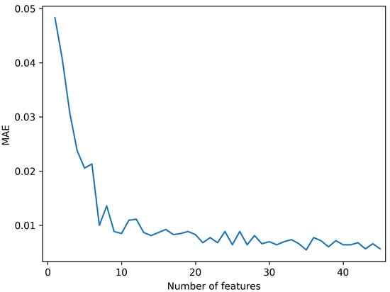 Step 3. To compute the MAE, we run the RF model for the varying number of features from 1 to 45. The MAE and the corresponding number of features are shown in Figure 11. It can be observed that the MAE is basically stable when the number of features is more than 21. It also means that the MAE will not decrease seriously when we choose more than 21 features. Thus, the first 21 features in Figure 10 are selected for the model training and classification. By checking the feature number in Table 2, we can know that they are number 35, number 26, number 20, number 21, number 23, number 5, number 41, number 3, number 1, number 24, number 2, number 38, number 37, number 39, number 4, number 6, number 45, number 43, number 34, number 15 and number 13.