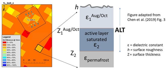 An example soil profile for a given pixel of the Chen et al. (2019) product. Each pixel has a surface roughness h, which is constant between the August and October SAR backscatter retrievals. The saturated active layer has a consistent dielectric (𝛆2) constant that depends only on the soil porosity. Between retrievals of the SAR instrument, the depth of the unsaturated surface layer (Z1) and the dielectric constant of the unsaturated surface layer(𝛆1) change. Z2 is the depth of the active layer which is assumed to not vary substantially between maximum thaw (August) and partially frozen (October) in which most of the freezing occurs from the top down. The square labeled ‘TL_SAR_4’ is a ground-truthing plot established by the Next Generation Ecosystem Experiment Arctic (NGEE Arctic) with labeled points representing in situ soil moisture observations. Figure is adapted from Chen et al., 2019, Figure 3 [].