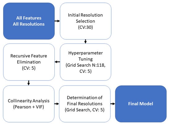 The fitting procedure consists of an initial resolution selection, hyperparameter tuning, recursive feature elimination, collinearity analysis (Pearson’s Correlation, Variance Inflation Factor, VIF), and the final resolution selection. A diagram of this procedure is shown in Figure 3.