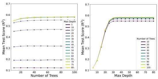 The impact of the number of trees (left) and the max depth of individual trees (right) on the R2 of the test data set (20 cm).