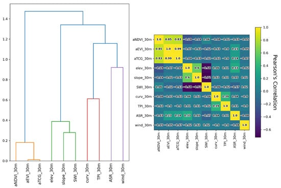 Hierarchical clustering dendrogram based on Ward’s method (left) [] and Pearson’s correlation matrix (right) of the ten predictor features at the highest resolution considered in this study. Four main clusters are identified: vegetation features: NDVI, EVI, and TCG; major topography features: elevation, slope, and SWI; minor topography features: curvature and TPI, and meteorological features: ASR and the wind factor.