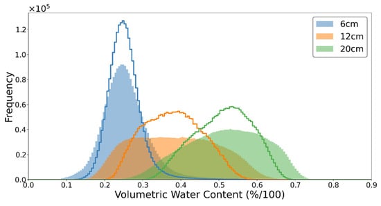 Distribution of SAR-derived volumetric water content for 6 cm, 12 cm, and 20 cm depths. The shaded histogram represents the SAR-derived soil moisture values and the lines are the associated random forest predictions for each depth.