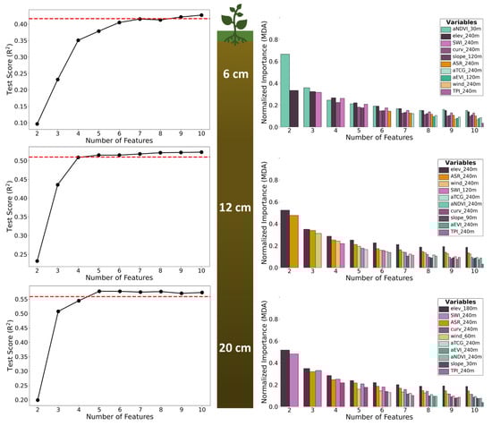 Results of a recursive feature elimination based on feature scales identified in the all-feature model. In the left-hand plots, we show an increase in the R2 of the test scores as the number of features increases. The dashed red line indicates a threshold of 2.5% used to identify the number of features used in the final model for each depth. The right-hand side plots show the permutation feature importance (MDA) for the features included in each model fitting stage. We show plots for 6 cm, 12 cm, and 20 cm soil depths.