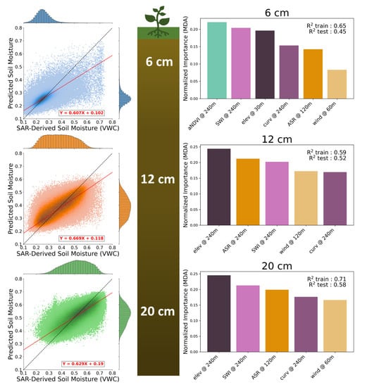 The final step was to determine the final feature resolutions through a grid search approach with shuffled cross-validation of five. Final model predictions and feature importances (MDA) for 6 cm, 12 cm, and 20 cm VWC are shown in Figure 8.