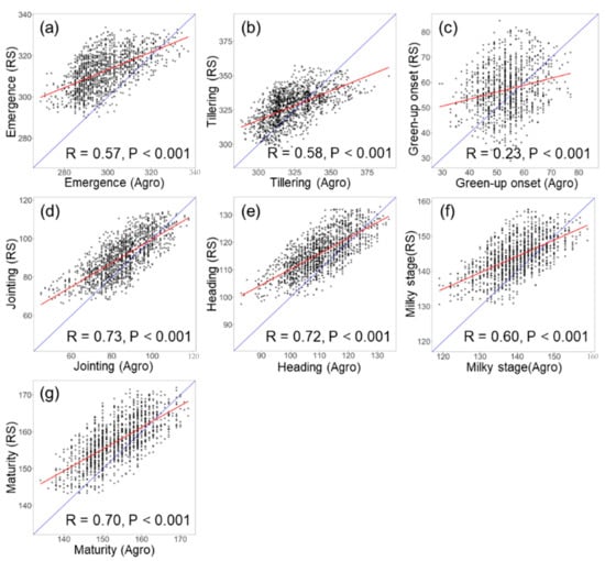 Comparison between CRTM-extracted phenological dates (Y-axis) and ground-based phenological observations (X-axis). (a) represents scatter plot for emergence, (b) represents scatter plot for tillering, (c) represents scatter plot for green-up onset, (d) represents scatter plot for jointing, (e) represents scatter plot for heading, (f) represents scatter plot for milky stage, and (g) represents scatter plot for maturity, respectively.
