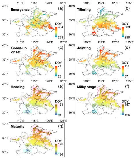 Figure 5 shows the spatial patterns of the multiyear average phenological dates in the study area. Overall, these phenological dates showed a clear spatial pattern from the south to the north. Specifically, the emergence and tillering dates were earlier in the north and later in the south. The latest dates of these two phenological dates occurred in the southeastern and southwestern parts of the study area, respectively. By contrast, the other five phenological dates (i.e., green-up onset, jointing, heading, milky stage, and maturity) were earlier in the southwestern part of the study area and gradually occurred later in the northeastern direction. The spatial variation of all of the wheat phenological dates was generally between 1 and 2 months in the study area.