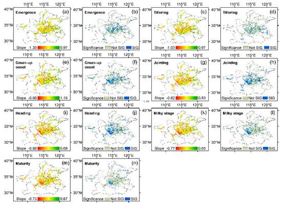 Phenological trends from 1981–1982 to 2015–2016. Negative slopes represent advanced phenological dates, and positive slopes, delayed dates. Wheat pixels with statistically significant trends (p < 0.05) are indicated in blue, and pixels without statistically significant trends are indicated in gray (p > 0.05). (a,b) represents trend and statistical significance of emergence, (c,d) represents trend and statistical significance of tillering, (e,f) represents trend and statistical significance of green-up onset, (g,h) represents trend and statistical significance of jointing, (i,j) represents trend and statistical significance of heading, (k,l) represents trend and statistical significance of milky stage, and (m,n) represents trend and statistical significance of maturity, respectively.