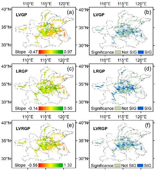 Trends of the growth period length (first column) calculated from 1981–1982 to 2015–2016 and its statistical significance (second column). The red color represents a shortened or decreasing trend, while the green color represents an extended or increasing trend. Negative slopes represent shortened trends, while positive slopes represent extended trends. Wheat pixels with statistically significant trends (p < 0.05) are indicated in blue, and pixels without statistical significance are indicated in gray (p > 0.05). (a,b) represents trend and statistical significance for LVGP, (c,d) represents trend and statistical significance for LRGP, and (e,f) represents trend and statistical significance for LVRGP, respectively.