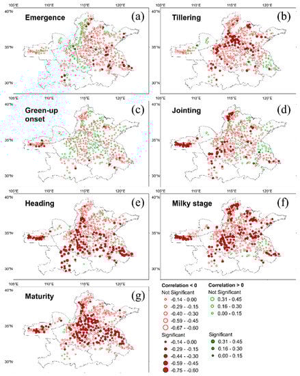 Correlation between phenological dates and corresponding preseason temperature from 1981 to 2016. Red circles represent negative correlations, and green circles represent positive correlations. Hollow circles indicate statistically insignificant correlations (p > 0.05), while solid circles indicate statistically significant correlations (p < 0.05). (a) represents correlation for emergence, (b) represents correlation for tillering, (c) represents correlation for green-up onset, (d) represents correlation for jointing, (e) represents correlation for heading, (f) represents correlation for milky stage, and (g) represents correlation for maturity, respectively.