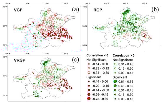 Correlations between different growth periods and intraseasonal temperatures from 1981 to 2016. Red circles represent negative correlations, and green circles represent positive correlations. Solid and hollow circles indicate statistically significant (p < 0.05) and insignificant (p > 0.05) correlations, respectively. (a) represents correlation for VGP, (b) represents correlation for RGP, and (c) represents correlation for VRGP, respectively.