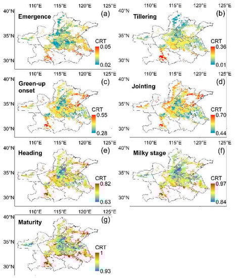 Spatial distribution of the calibrated relative threshold (CRT) for different phenological dates based on ground-based phenological observations. (a) illustrates spatial distribution of CRT for emergence, (b) illustrates spatial distribution of CRT for tillering, (c) illustrates spatial distribution of CRT for green-up onset, (d) illustrates spatial distribution of CRT for jointing, (e) illustrates spatial distribution of CRT for heading, (f) illustrates spatial distribution of CRT for milky stage, and (g) illustrates spatial distribution of CRT for maturity, respectively.