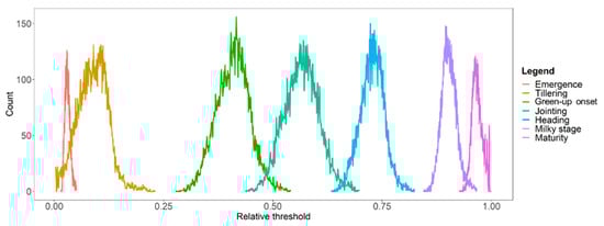 Figure 12 shows the histogram of relative thresholds (CRT) for different phenological dates. As the histogram of the relative thresholds at emergence was narrow (red curve in Figure 12) and fluctuated between 0.02 and 0.05 (Figure 11a), a fixed relative threshold (i.e., taking the average of 0.02 and 0.05) was used throughout the study area when extracting the emergence date using the relative threshold method. For the other phenological dates (i.e., tillering, green-up onset, jointing, heading, milky stage, and maturity), our result showed there was no globally fixed threshold for extracting the phenological date across the study area due to the wide spatial variation of the relative thresholds (Figure 11). Therefore, using a fixed empirically based relative threshold (e.g., 10%, 20%, or 50%) to extract the phenological date would introduce large bias and uncertainty, especially over large areas.