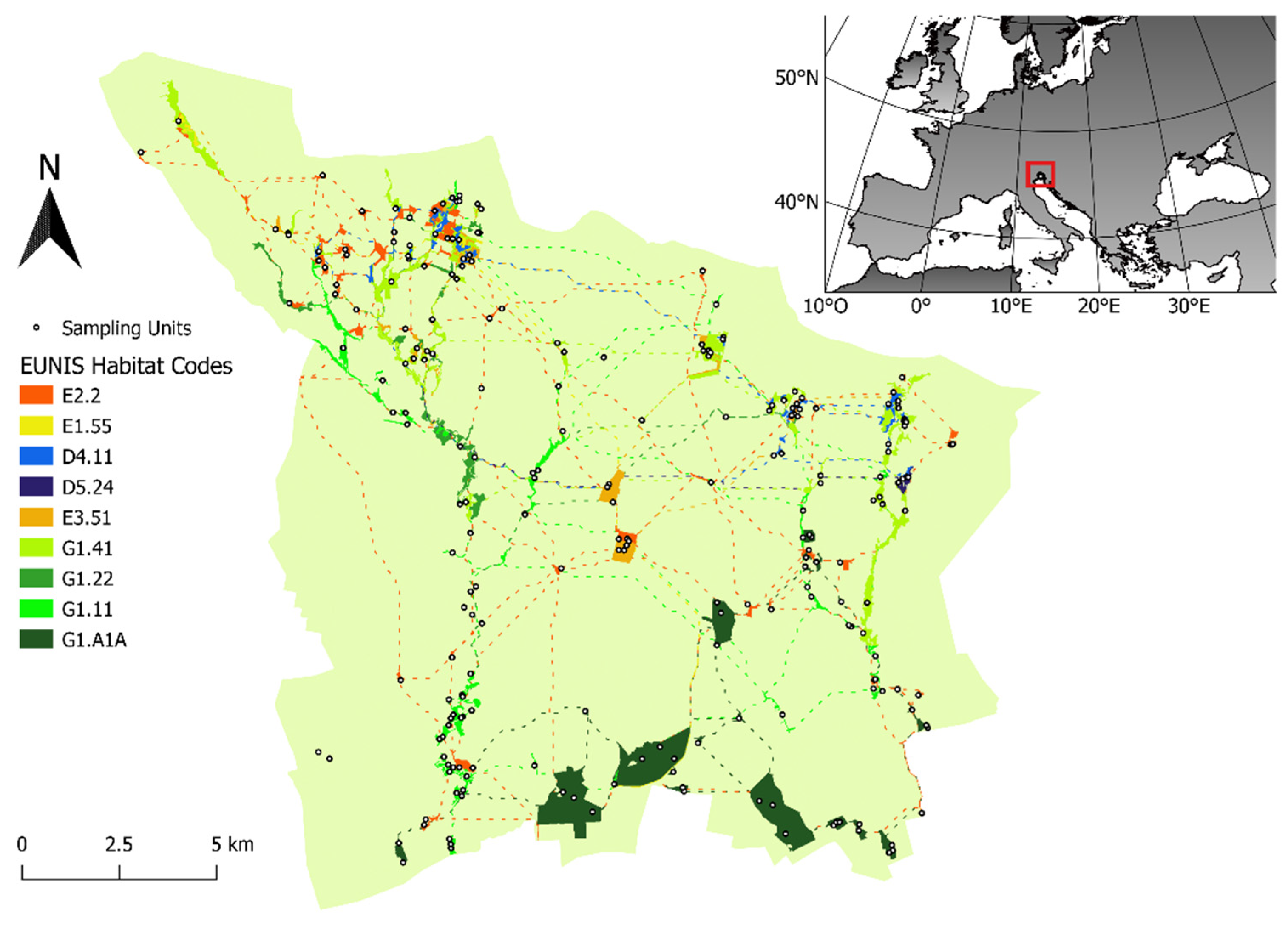 - Liccari, F.; Sigura, M.; Tordoni, E.; Boscutti, F.; Bacaro, G. Determining plant diversity within interconnected natural habitat remnants (ecological network) in an agricultural landscape: A matter of sampling design? Diversity 2022, 14, 12. [Google Scholar] [CrossRef]