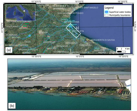 The coastal plain of Tavoliere delle Puglie: (a) geographic map of the coastal plain; (b) aerial photograph of the salt marshes located in the Zapponeta area with defenses built along the coast.