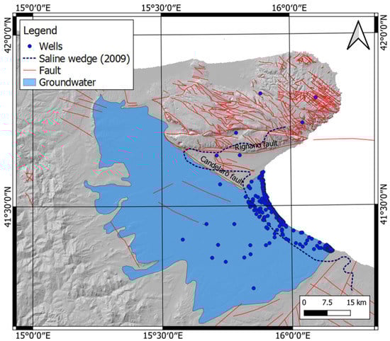 The subsidence in this area determines the advancement of the Ghyben–Herzberg interface [], producing a reduction in freshwater resources. Furthermore, in the northern part of Tavoliere delle Puglie, in correspondence with the Candelaro fault (Figure 2), saltwater reaches even farther inland, since this tectonic structure enhances the water flow rather than acting as a hydraulic barrier. Many authors [,,,] report high water-temperature and salinity values linked to the mixing of deep water and freshwater.
