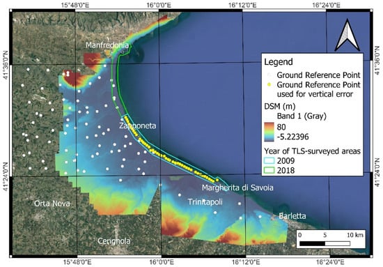 Digital Surface Model (DSM) obtained for the coastal area. The ALS data were acquired for the inland areas [] while TLS surveys were performed for the coastal area (light blue and green polygons). The Ground Reference Points (GRPs, white points) were obtained through GPS static survey and Total Station leveling; the GRPs reported in yellow were used for the vertical error assessment of DSM. Background map was obtained from Google Satellite.