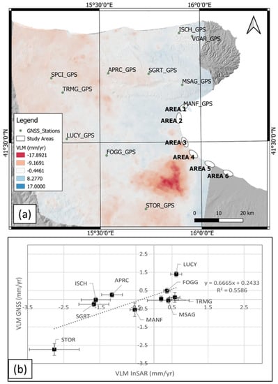 Vertical Land Movement assessed in northern Apulia: (a) GNSS stations’ positions with the background VLM map obtained from PS InSAR data (interpolated on a regular grid with 250-m posting by means of nearest-neighbour gridding method), draped over a shaded DEM of the study area; the six representative areas, discussed in the text, are indicated by ellipses; (b) comparison (scatter plot) between GNSS-velocity (projected onto the SAR LoS) and SAR-velocity components.