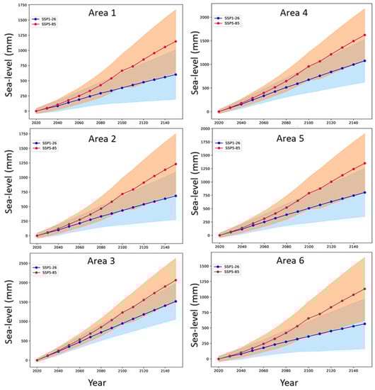 Projections of sea-level rises for the areas of Tavoliere delle Puglie; SSP1-2.6 and SSP5-8.5 represent the low and high atmospheric-greenhouse-gas-concentration scenarios, respectively.