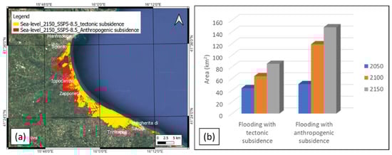 Comparison of relative sea-level-rise scenarios for tectonic and anthropogenic contributions of land subsidence: (a) flooding surface with tectonic subsidence (yellow color) and with anthropogenic subsidence (red color); (b) histograms of multitemporal (2050, 2100, 2150) flooding area as a function of the tectonic and anthropogenic subsidence.
