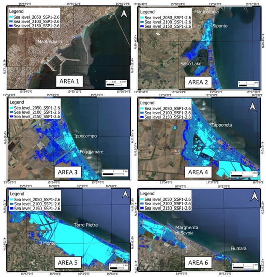 Flooding surfaces were assessed for the studied areas under different sea-level projections.