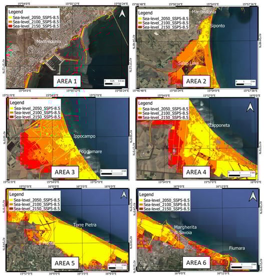 To evaluate the assets potentially exposed to SLR, a spatial overlay between the modeled zones of inundation for each scenario and high-resolution land-use data was analyzed in GIS environments. The land-use data are freely available in the Regione Puglia geoportal https://pugliacon.regione.puglia.it/web/sit-puglia-sit/home#menu (accessed on 18 August 2022) []. The spatial overlay was also performed on nature-protection areas that fall within the Europe-wide Natura 2000 network. By means of this analysis, the following data were obtained for each SLR scenario: (1) the percentage value of each land-use category expected to be lost in the total submerged area; and (2) the surfaces of protected areas expected to be affected by submersion.
