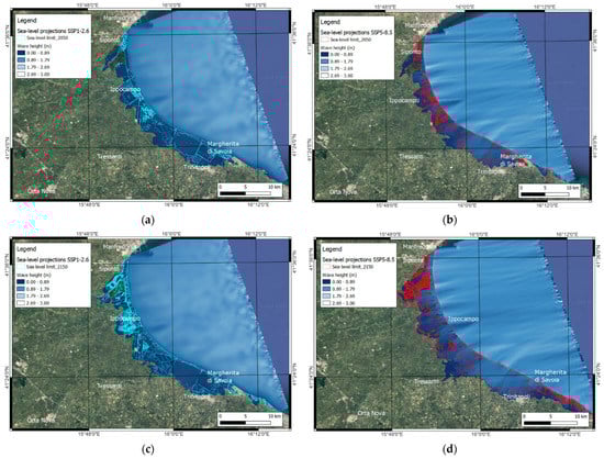 For each timestep, the best- and worst-case flooding scenarios were modeled using the IPCC SSP1-2.6 (reduction in greenhouse gases in the atmosphere) and IPCC SSP5-8.5 (no greenhouse-gas reduction, business as usual) SLR projections, respectively, corrected as described above. In addition, the impact of storm events was modeled under different RSLR scenarios, in which the impact of storm waves can determine the temporary flooding of low-lying areas. The implications of the RSLR projections and related expected flooded zones include the eventual loss of socio-economic activities in proximity to the coast and groundwater pollution due to the inland advancement of the saline wedge.