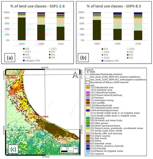Percentage values of areas in each land-use category affected by sea-level rise in 2050, 2100, and 2150. (a) The percentages refer to the total area flooded in the SSP1-2.6 scenario. (b) The percentages refer to the total area flooded in the SSP5-8.5 scenario. All the land-use categories showing a percentage value of lower than 1% are grouped in a single class. (c) Influence of sea-level rise (SSP5-8.5, time step 2150) on the land use of Tavoliere delle Puglie with associated saltwater/freshwater edge (data from Apulia Region, 1984 []).