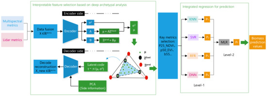 With multi-source remote sensing data utilized for biomass prediction, many VI features can be obtained, with varying degrees of importance to the biomass prediction task. With limited training samples, simple concatenation or stacking of different feature objects may contain redundant information or result in overfitting models [13]. Therefore, feature dimensionality reduction is necessary when using multi-source remote sensing multispectral and LiDAR indicator data feature metrics [14]. For example, Cao et al. [15] used exploratory data analysis to select variables significantly associated with wheat yield. Li et al. [16] used the ReliefF feature selection algorithm to select two narrow-band vegetation indices for predicting potato yield. Zhang et al. [17] used a total of three methods of stepwise regression analysis, recursive feature elimination and Boruta analysis to select features for forest height estimation, all with relatively good results. There are also other feature transformation methods performing good feature learning for biomass estimation, such as principal component analysis (PCA) [18]. In fact, model interpretability is a key focus for feature learning in applications for agriculture and the forestry industry [19,20]. The lack of interpretability of the learning process make it difficult to find effective reference information to constrain and improve optimization of existing problems. Nowadays, the deep learning network is well known as a first choice for feature learning; however, limited model interpretability is a major problem when it is used for multi-source remote-sensing-based biomass prediction without being capable of providing features that have physical meaning. Moreover, most available deep learning networks are supervised. Archetypal analysis (AA) [21,22] aims to find data archetypes with extreme properties and shows great potential for feature learning. Given its ability to deliver good model interpretation, its kernel extension has been explored for extracting multi-source remote sensing metrics to facilitate forest age attribute evaluation by modification with fast implementation [13]. As with the probabilistic realization of AA by Seth [23], Keller et al. [24] proposed a deep archetypal analysis (DAA) in their latest research, which presents a significant ability to achieve unsupervised non-linear feature learning in potential space and is especially useful for applications with small training sets. Moreover, DAA allows use of a priori auxiliary information to guide the search for interpretable archetypal features. DAA, shows great potential for mining informative interpretable features in abundant multisource remote sensing data for biomass prediction through unsupervised non-linear deep learning by adding proper guiding information.