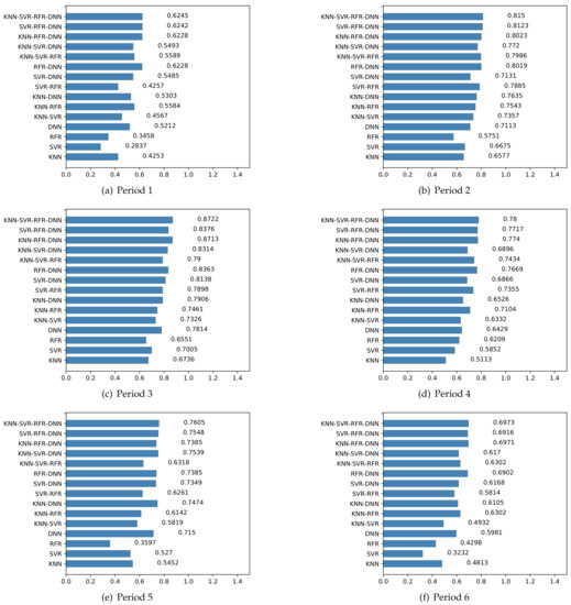 Table 2 further displays the combination coefficients for the four base learners in the secondary integration learning layer with MLR. The higher the regression coefficient of a particular base learner is, the more significant its contribution to the final prediction performance will be. The effect of linear KNN on the performance of the stacking model has a positive correlation in the early periods and shows a negative correlation in the later stages, but the overall contribution is small with the regression coefficient being stable around 0.2. Interestingly, the trend of the integration coefficient of the non-linear SVR model is opposite that of KNN. It witnessed a steady decline, followed by a sharp fluctuation, first increasing, then decreasing. It maintains negative contributions in the integration for biomass prediction in the first three early stages and the final period. A positive coefficient for integration is only found in two stages. Over the six periods of the forecasting task, the RFR model shows a more stable performance, with regression coefficients fluctuating between 0.3 and 0.5. The DNN model makes the greatest contribution among all the base learners in all periods.