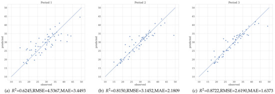 Scatter plots of observed versus predicted values fitted using the best predictors for the six periods.