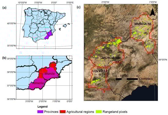 Three agricultural regions of Southeast Spain were selected (Figure 1): Los Velez in the province of Almeria, and the Northwest and Northeast in the province of Murcia, which will be called Murcia-NW and Murcia-NE, respectively, for clarity. These three regions have a Mediterranean arid climate with an average annual precipitation of less than 300 mm, although with regional variations []. The spatial resolution used was 250 m/pixel. This spatial resolution matches the resolution used by most stakeholders in the Spanish agricultural insurance system. The pixel selection was provided by ENtidad Estatal de Seguros Agrarios (ENESA, Ministerio de Agricultura, Pesca y Alimentación, Government of Spain), using the Sistema de Información Geográfico de Parcelas Agrícolas (SIGPAC []) and the Mapa Forestal Español (MFE, Spanish Forest Map). Firstly, pixels categorised as rangeland were selected using the SIGPAC. Secondly, using the previous selection, pixels with a tree coverage higher than 15% were discarded to ensure a low tree coverage, based on the MFE. Three thousand six hundred and fifty-four (3654) pixels of rangelands were selected, consisting of grasslands, shrublands, and open woodlands.
