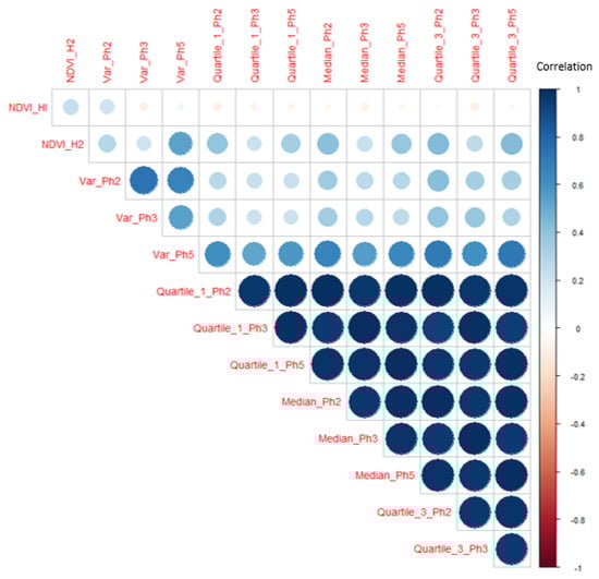 All summary statistics between the three selected phases presented a robust linear correlation (>0.75) except for the three variances (Figure 2). Principal component analyses (PCA) were performed with our statistic variables, including the Hurst exponents (HI and H2). Moreover, among those variables with a strong correlation, quartile 3 of phase 5 was chosen for its higher explanatory power (Table A1 and Table A2). The three variances and quartile 3 of phase 5 were used separately with HI and H2, and with neither of them.