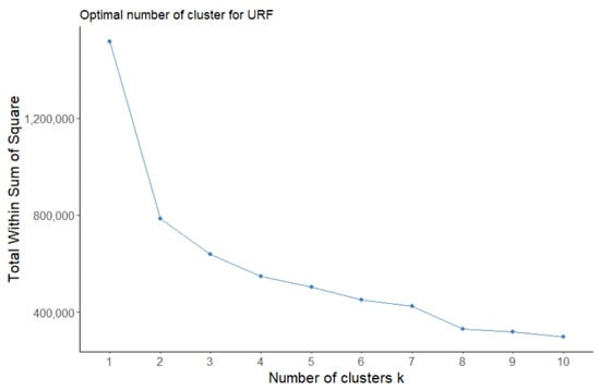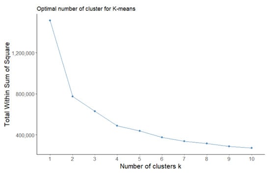 The algorithm repeats this process by adjusting the centroids based on the calculated distance, iterating a set number, and converging in a fixed point []. In this paper, Hartigan and Wong’s method was used [] with the R package “stats v. 3.6.2” []. This method reassigns point by point, considering the shift in the means after the reassignment of previous points, and it may reassign a point even if it already has an assigned centre.