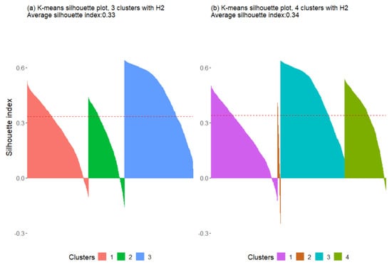 The k-mean analyses were applied, using the aforementioned selected variables, for three and four clusters based on the elbow method. The elbow method is a heuristic method to determine the number of clusters in a dataset [], as shown in Figure 3. K-means clustering was different when three (three-cluster analyses) and four (four-cluster analyses) clusters were used. However, for each cluster number, the results were identical whether no Hurst exponent, H2 or HI were used. The clustering results presented an adjusted Rand Index of 1 among the three-cluster analyses and an adjusted Rand Index of 0.84 when comparing the results of three- and four-cluster analyses. The fourth cluster showed very few pixels with a low Silhouette Index for this cluster, as shown in Figure 4. The Silhouette Index was the same in all k-means analyses with three- and four-cluster analyses (Table 1).